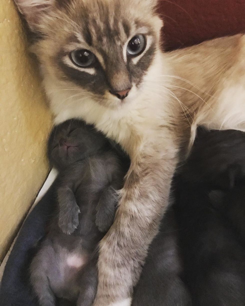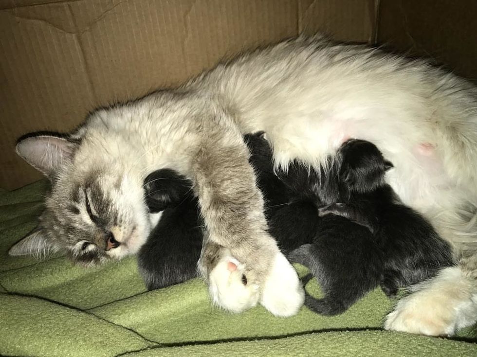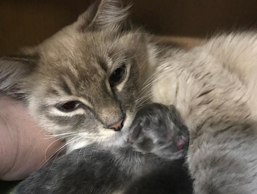 11 days after they brought her in, Millie welcomed five beautiful, healthy grey kittens into the world.