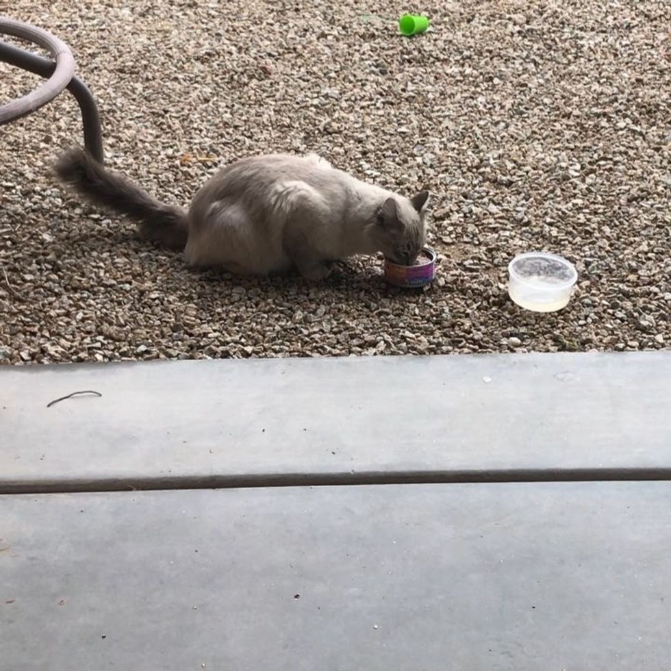 Kara Yancey from Phoenix, Arizona noticed a long-haired cat in her backyard a couple of months ago. She was very skittish and would run the second she heard or saw anyone from the house. Kara, who is a foster volunteer for Living The Dream Rescue, started leaving food out on her back porch.