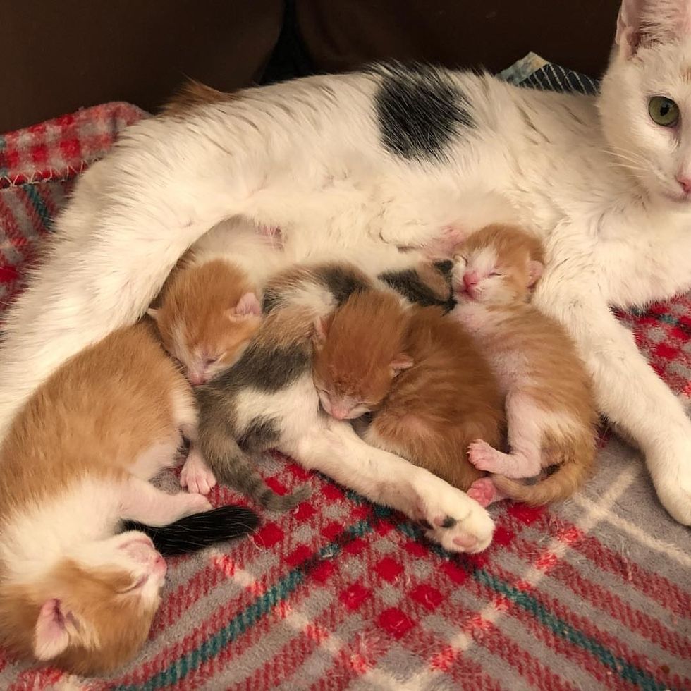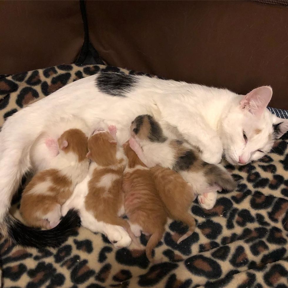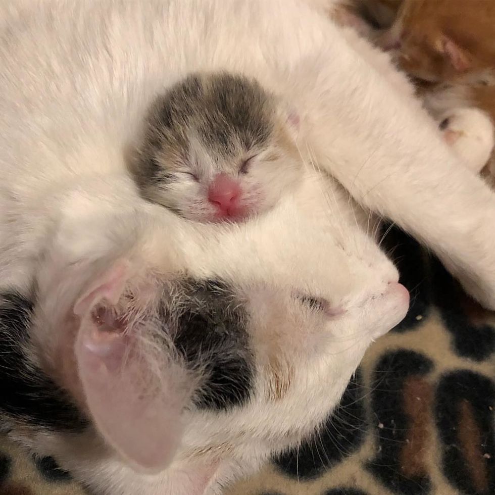 She spent most of her time nursing and keeping her kittens clean and groomed. When the babies were sleeping, she cuddled with them, watching over them every step of the way.