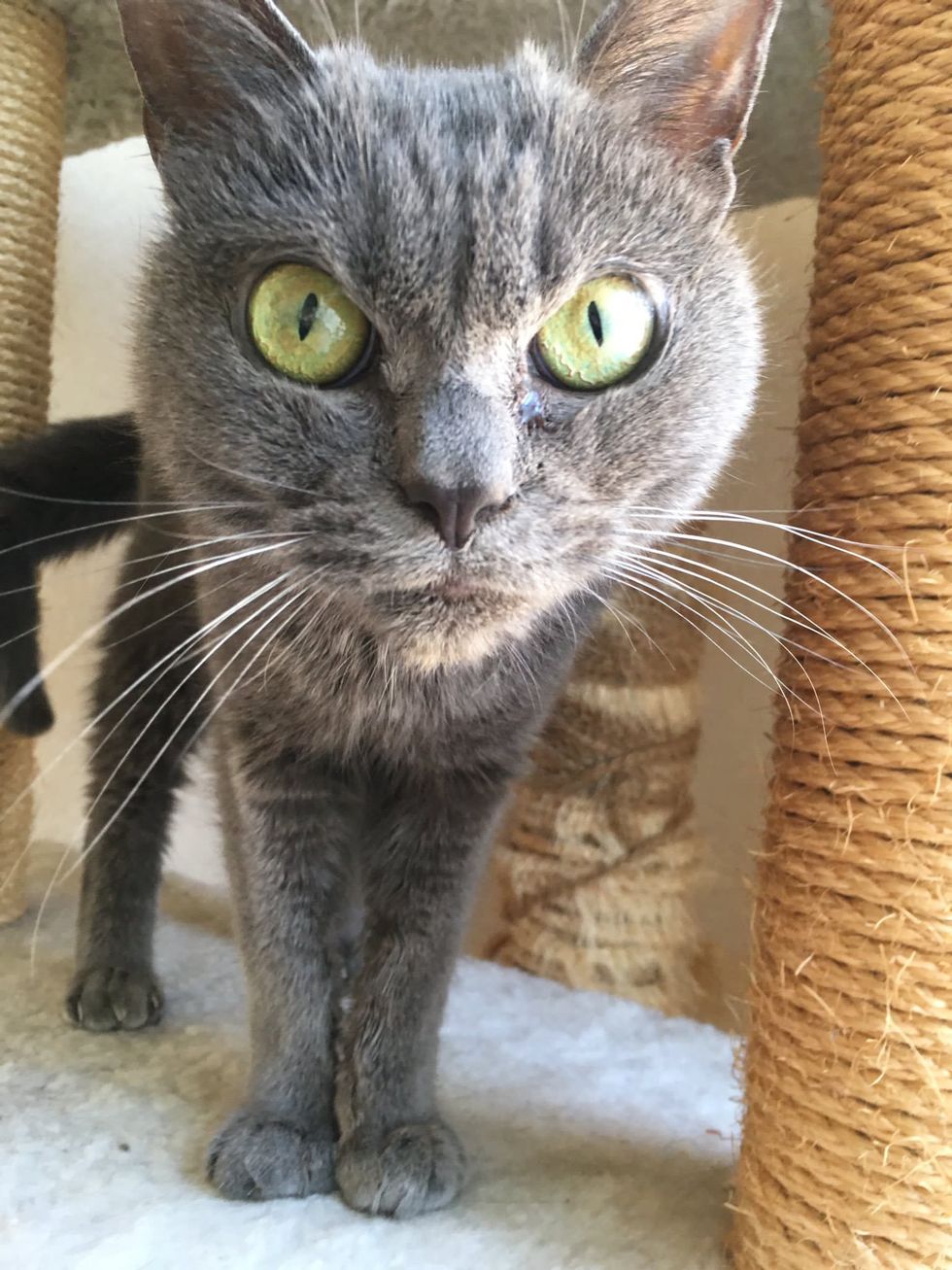 A senior cat has been waiting for her forever home for more than a year but got overlooked because of her perpetual grumpy face.