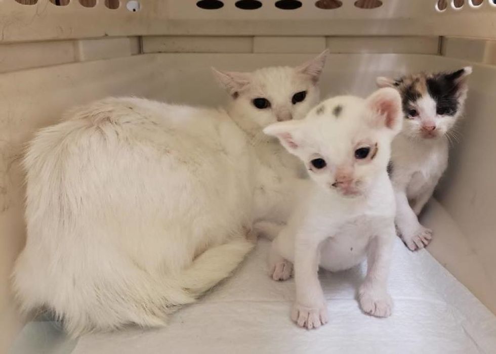 A cat was spotted inside a small carrier that had been left at the front entrance of a cat sanctuary in Parlier, California. As staff gently took the kitty out of the carrier, they were shocked to find three tiny bundles of fur right behind her.