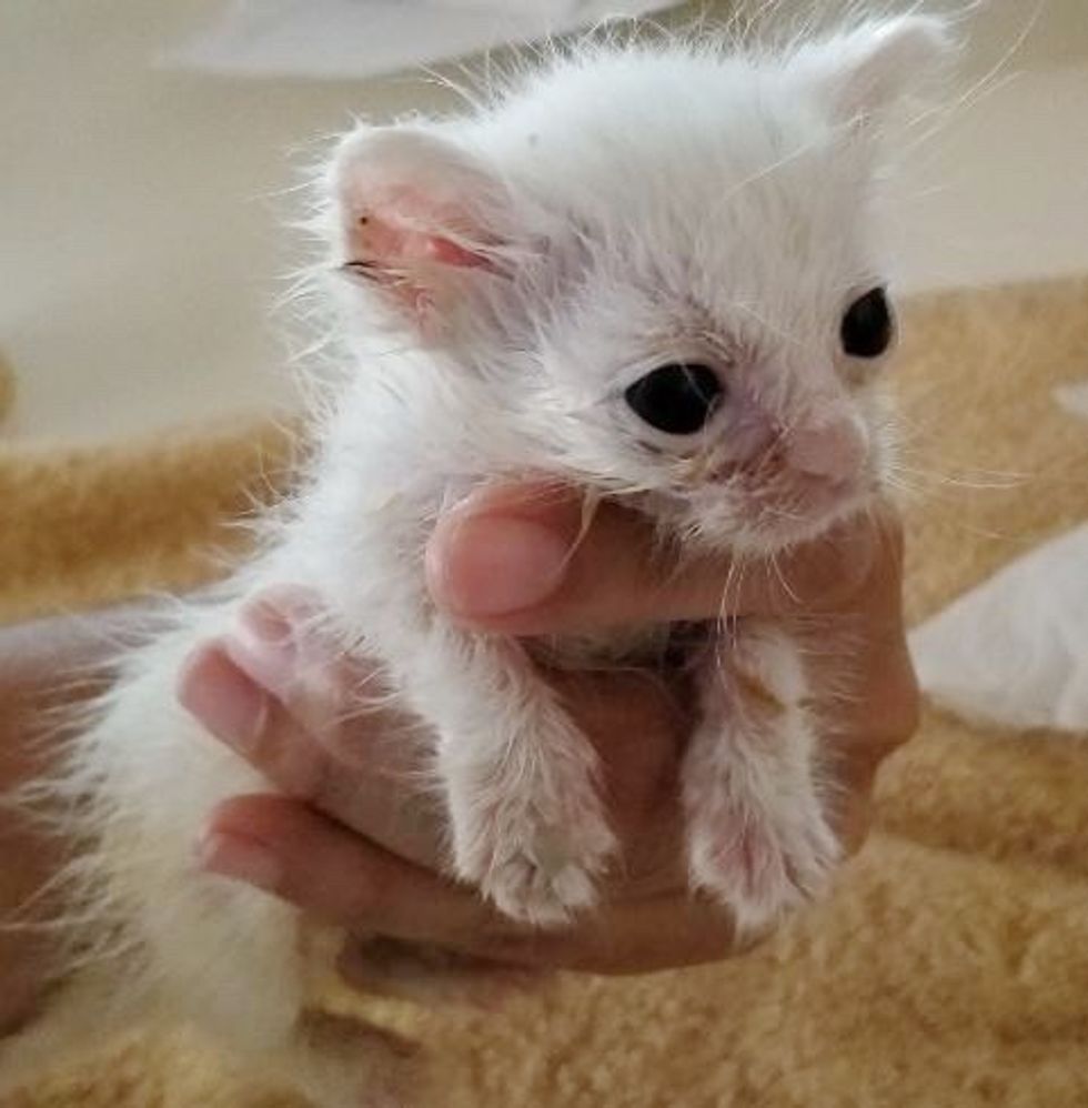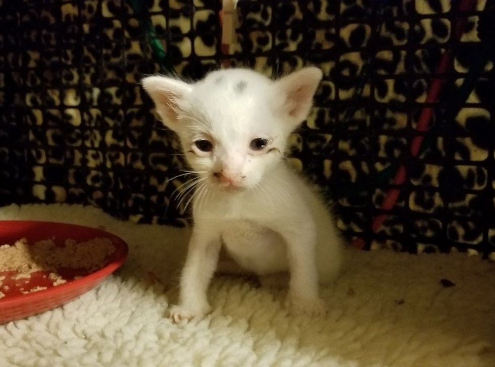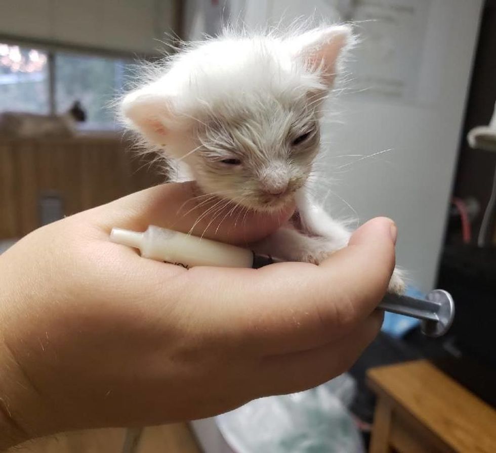The kittens were two weeks old and in need of medical attention. "They are all under the weather. The runt is a fighter and Lynea Lattanzio (Executive Director of the Cat House on the Kings) suggested naming him after a prize fighter, Sugar Ray."
