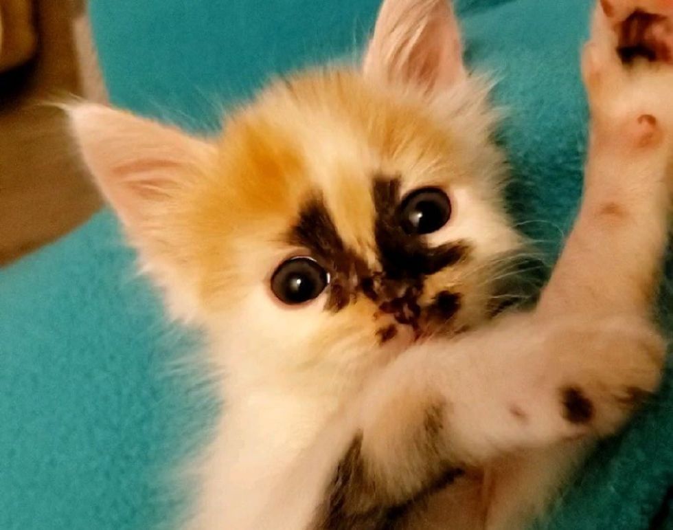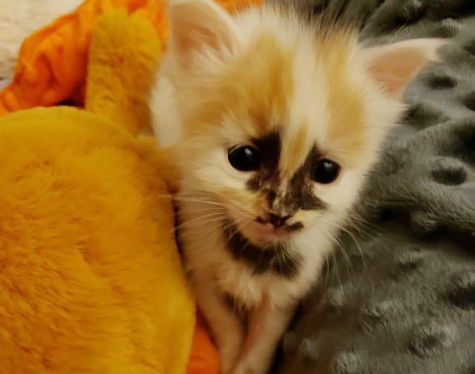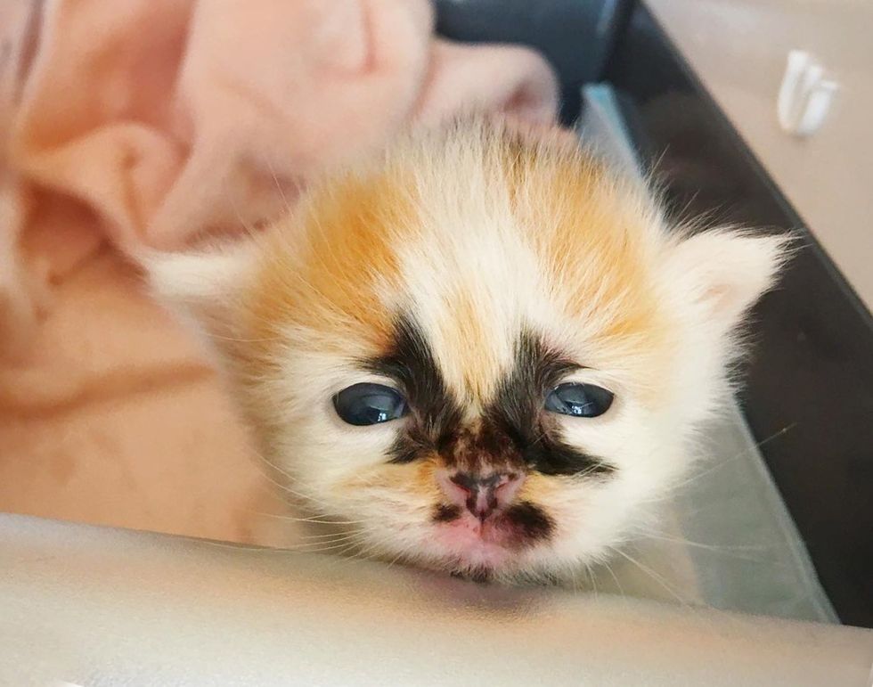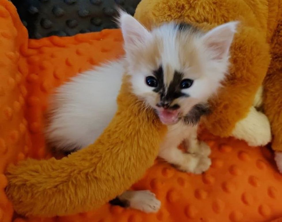 A kitten with unique markings insists on getting all the attention after she was brought back from the brink.
