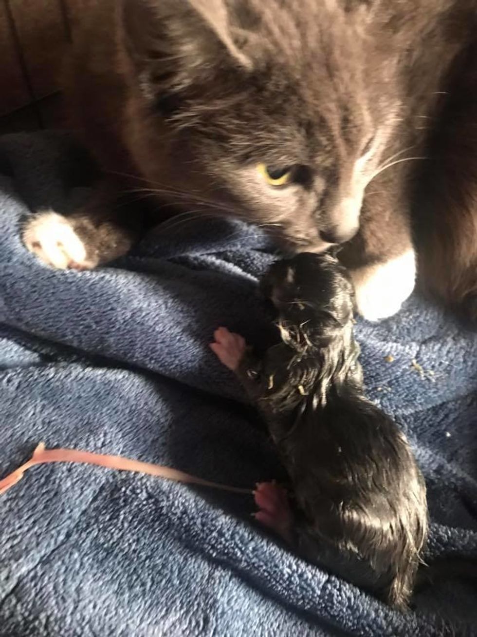 The cat mama started cleaning and nursing her newborns. One after another, Mama gave birth to a litter of four kittens in the comfort of a warm home.