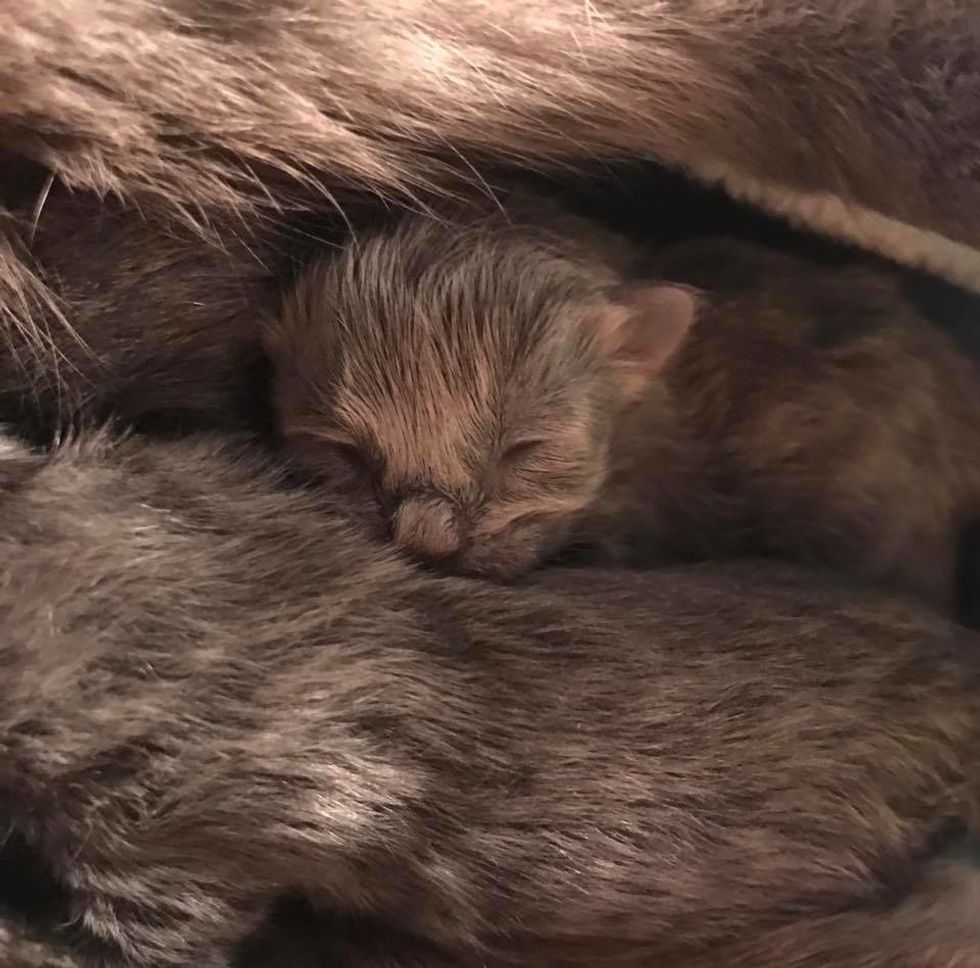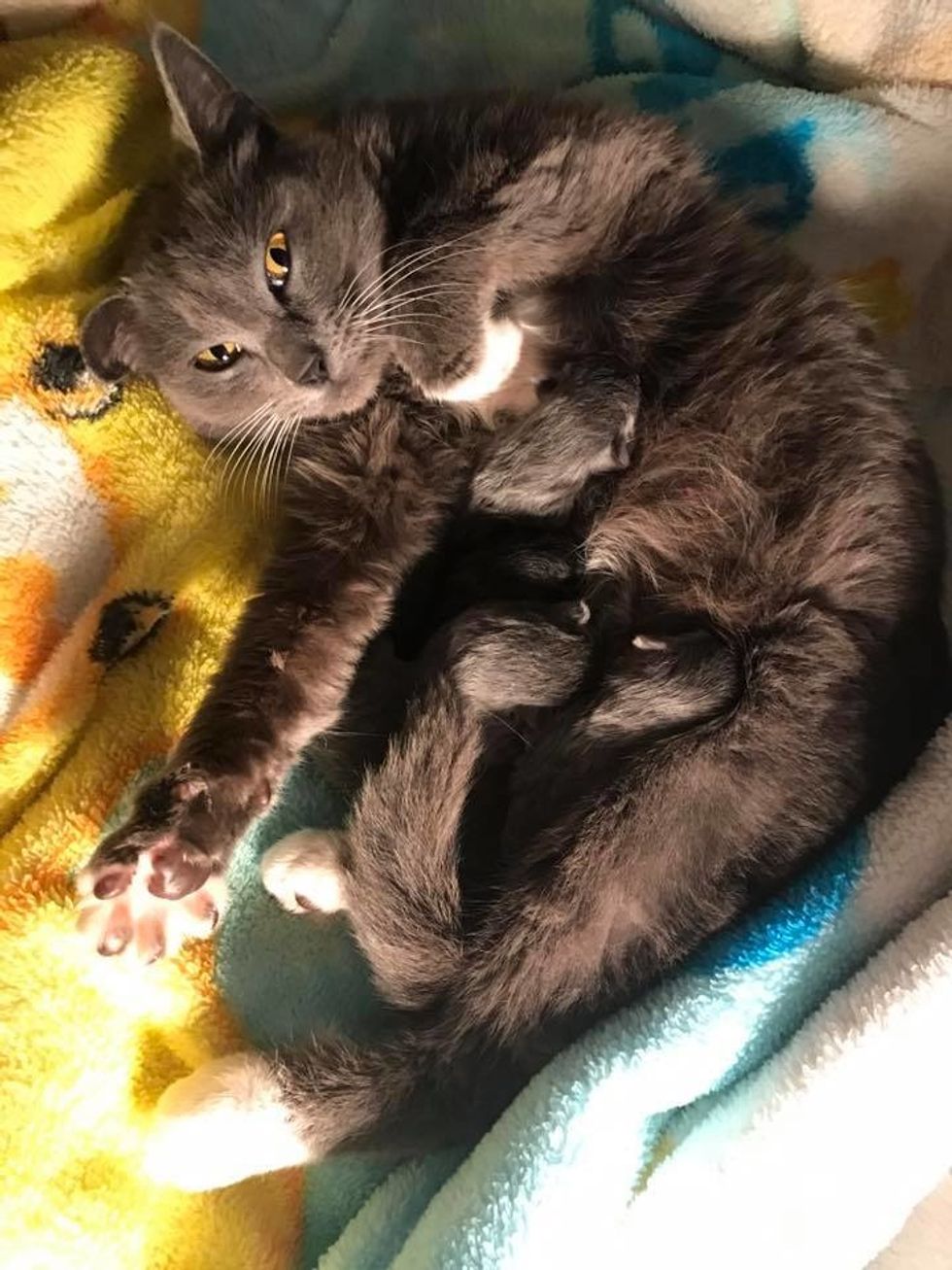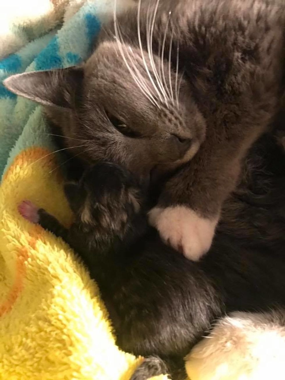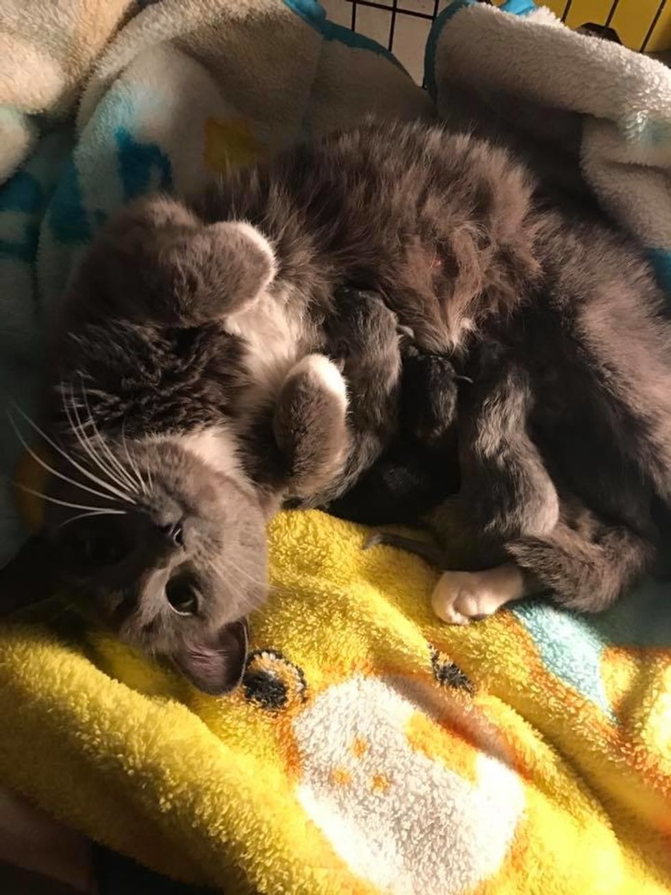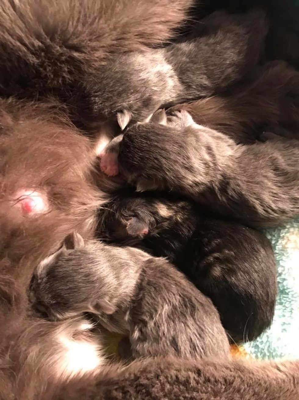 After 24 hours, the kittens were eating well and had already put on weight. The mama cat was as sweet as can be, kneading away with her paws in pure bliss while nursing her babies.