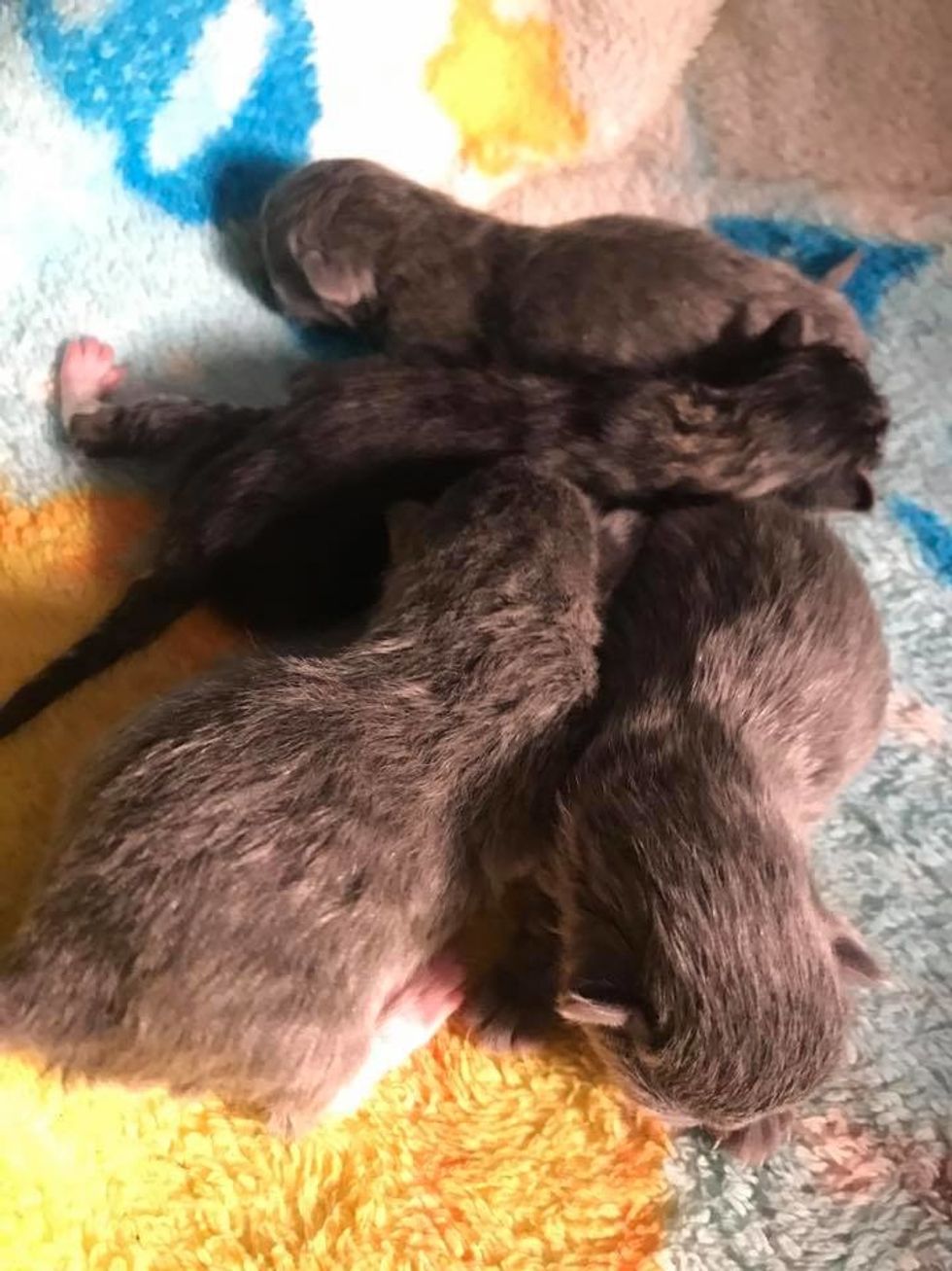 All four kittens are thriving in the best care with their cat mama looking after them around the clock.